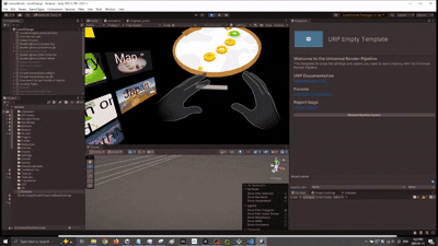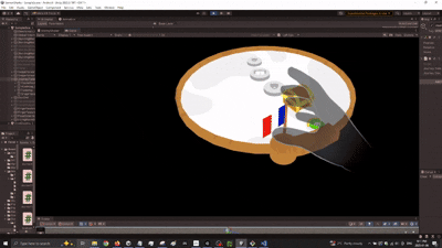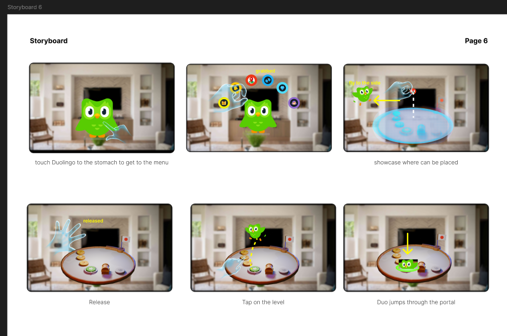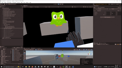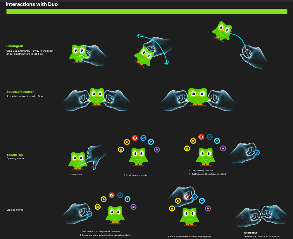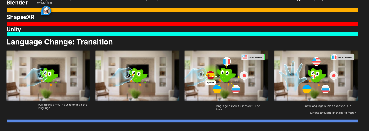 DuolingoXR is more than just a mixed reality port of Duolingo—it’s an exploration of what happens when Duo,the mascot of Duolingo, escapes from your phone.Meta QuestC#Unity, Meta hand tracking, ShapesXR, Figma, Github, NotionDec 2024-Jan 2025As the lead developer with 5 other memebers consisting of audio designer and 3d artists, we were tasked with mobile to XR app. Education was something that came up in our discussion alot and we decided to choose Duolingo as the app to prototype into XR My job was to take artists 3d animations and models into Unity. Setup Meta Hand tracking sdk and make sure there is a working prototype that users can interact with We had to make sure artists and myself as a developer are aligned. We would create figma designs to make sure we know the art direction, and the feel want to go with. This also helped us narrow the scope and features we want to use. Below is just one tiny part of the figma design. Includes somethings that we translated into Unity which I will explain how I did it!We made visuals of how hand interactions would work in FigmaWe would create storyboards to make sure the Golden path is establishedWe also did our research and all signed up to Duolingo to make sure we understand what works in 2D and what can be translated into 3DFirst I worked on hand recognition. When I put my hand out and have one finger pointing out, Duo would fly towards my finger and stay on my finger. Then using my hand to do a swipe action as if I'm petting, Duo would play an animation. Sticking out other fingers, Duo would not stay on my finger anymore. One challenge was making sure the Owl goes towards and stops at my finger. I did this by checking when Duo has reached my hand, once it reaches my hand, if I am still pointing with one finger, Duo will be childed to the finger until that's not the case. Since there were different hand poses going, I first tried to make sure the swiping was working. I did this by checking if Duo's poses would change everytime I swipeNext is the hand pose. I need to make sure Duo can fly towards my finger NO MATTER which hand I am using.Finally, I combine the petting and Duo flying towards my finger together! This time with the final Duo animationNext task was to create a journey table. In Duolingo, you can scroll up and down the journey to see which lesson you are on. Since we are creating an XR app, we need to convert this 2D journey into a 3D version. We thought of a rotating journey table. The table required scaling discs and the user turning the table. First was figuring out how to scale the discs. Here was an early attempt with just up down arrows and a gameobject. When the object was close to the edge, it scales down. If the object was further away from the edge, it scales up.Now that using a dummy object worked. It was time to test it on the real model. As you can see, the models scales up and down depending if it's closer to the middle or the edgeWith the scaling object issue resolved. It is time for a way for the user to scale them up...since there are no up down arrows in a headset. First we tried to see if having the user rotate the object by pinching the edge of the journey table would feel natural.Pinching the edge of the table did not feel natural. We decided to use the flag handle to rotate. I did this by treating the journey table like opening and closing a door. Where there is a "hinge" and the handle is like the doorknob. This felt way more natural. Additionally, instead of up down, the rotation is controlling when the objects on the table is moving, since the objects moving is isolated from other scripts, the scaling up and down logic wasn't affectedThe journey table was working but the scale or position of the table may not be where the user wants. We needed a way for the user to move or scale the table. We tried to think of a way and decided to use a common VR practice which was adding a bar with visual color change feedback when the user has touched the bar. This was a good affordance for the user to understand how to move and scale the table Next was the Language Transition. We wanted a fun and interactive way for users to pick there langauge. What better way then to pick a language then for the user to grab the beak and have it tap on a language. When a language is tapped, a border would appear to signify the user has interacted with it. Once the user decides on a language, the user can let go of the beak while hovering on the language. The beak will SNAP back to Duo. This snapping was a feature in meta hand tracking which we utilizedThere was also level transition which we continued utilizing the snapping affect. We can grab a level and snap it on to the journey tableWe were announced as the winner for Best Mobile app to XR app and Best use of Shapes XR.Best use of ShapesXR winner annoucmentBest Mobile App to XR AppWe even got a shout out from ShapesXR on LinkedIn!Not only that, but NathieVR even posted it on his Youtube channel here was the person to introduce us at AWE!
