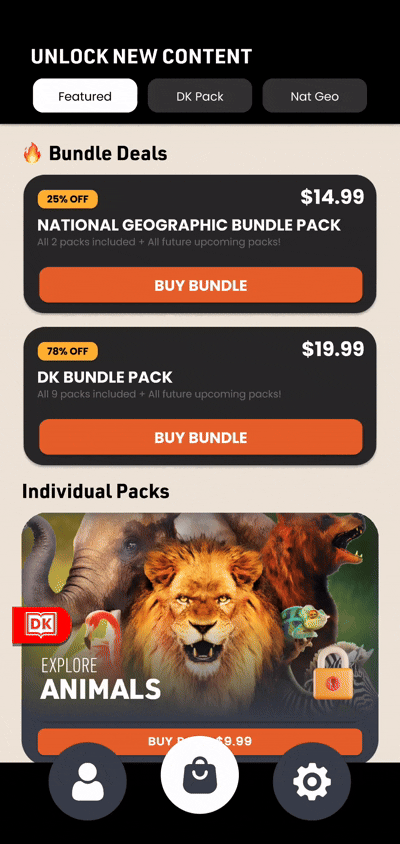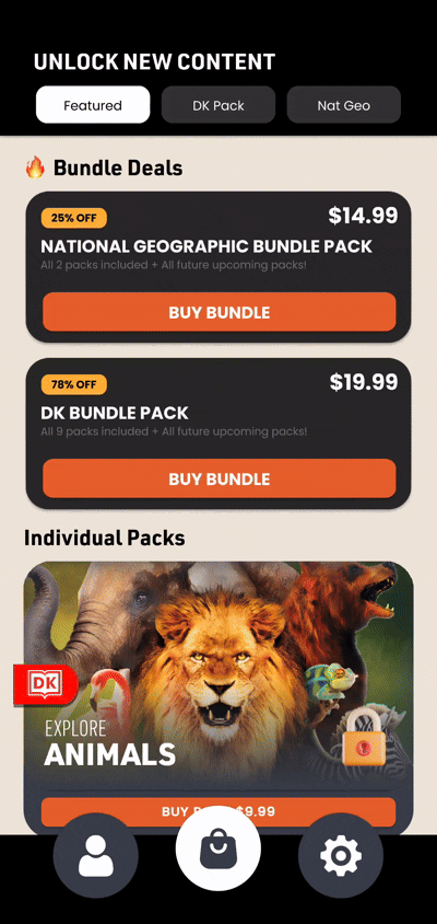 Then I set up tabs so users can go between All Packs, DK Packs, and National Geographic Packs. The pack is in a vertial layout group and it can be scrolled. Depending on the tab selected, I enable or disable the pack. Each pack can also be expanded to show a description of what the pack is before the user purchases. I used Dotween the control the scale and anchor of each gameobject.